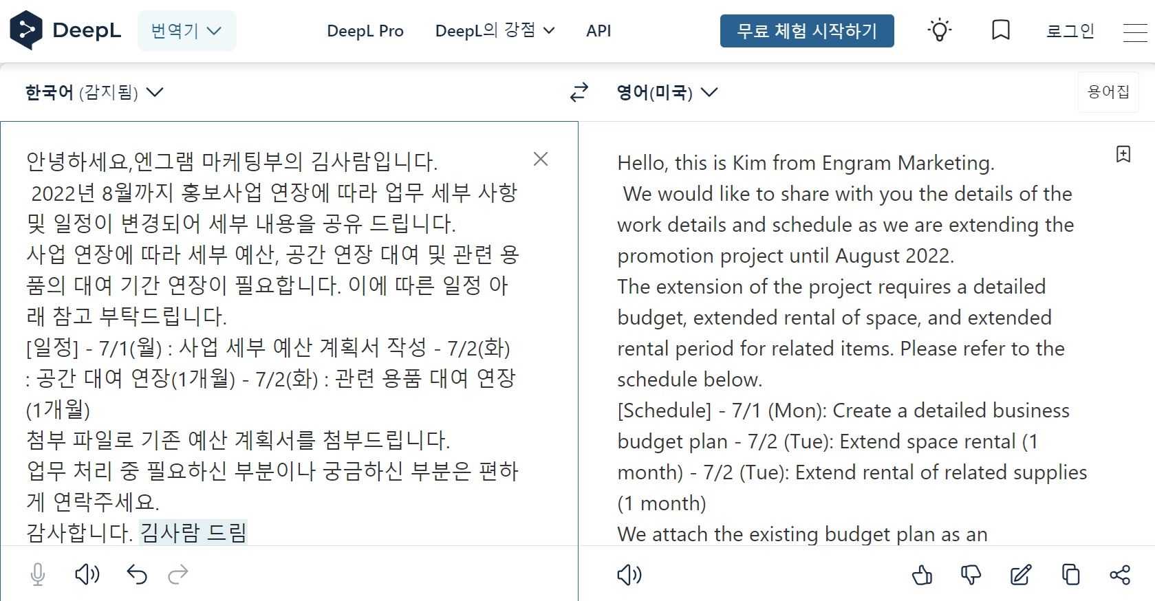 그런 면에서 딥엘과 엔그램 모두 기계번역의 장족의 발전을 보여주지만, 딥엘의 세계에서 가장 정확한 번역기라는 타이틀에서 오는 기대감에는 미치지 못하는 것으로 보입니다.
