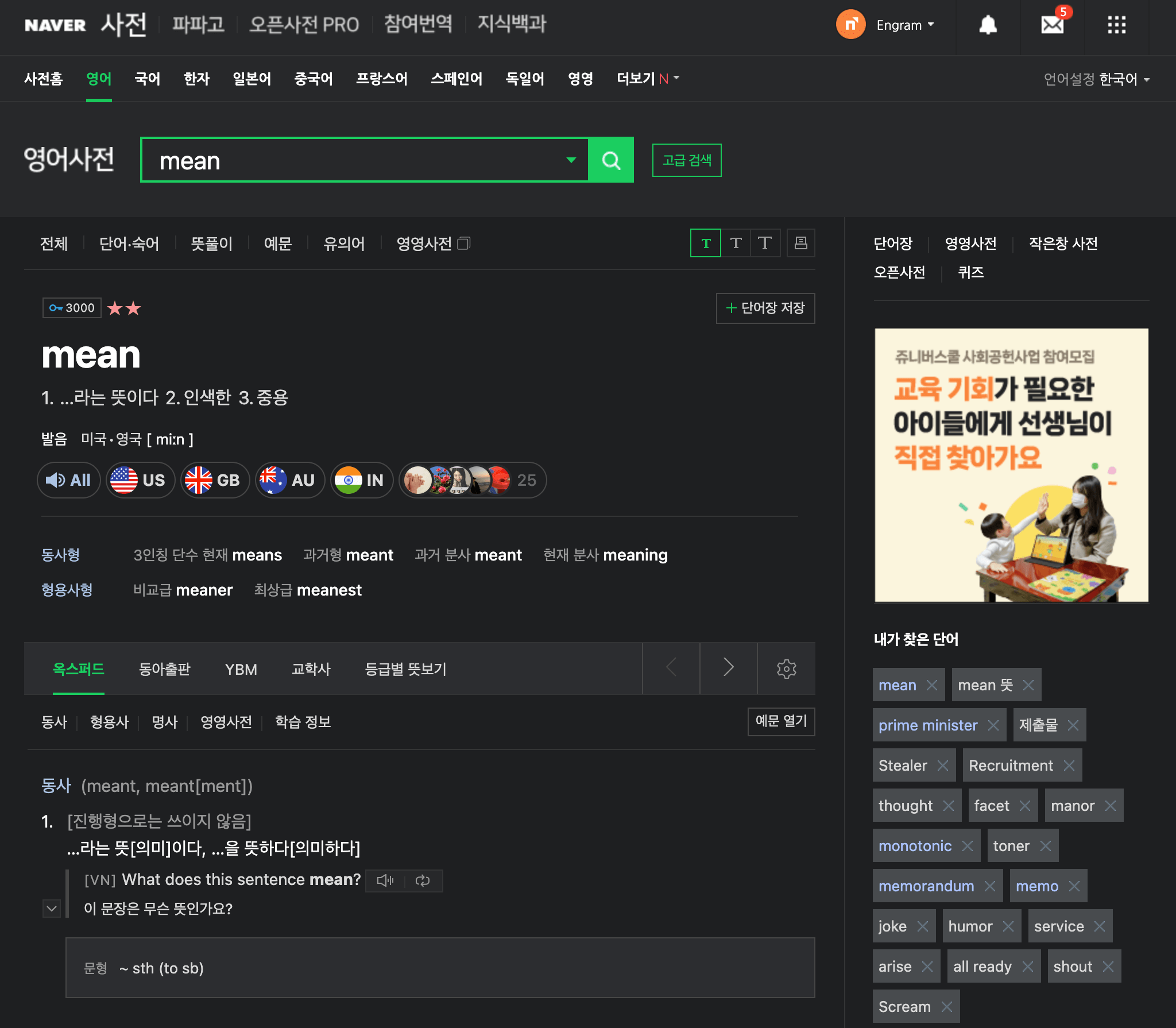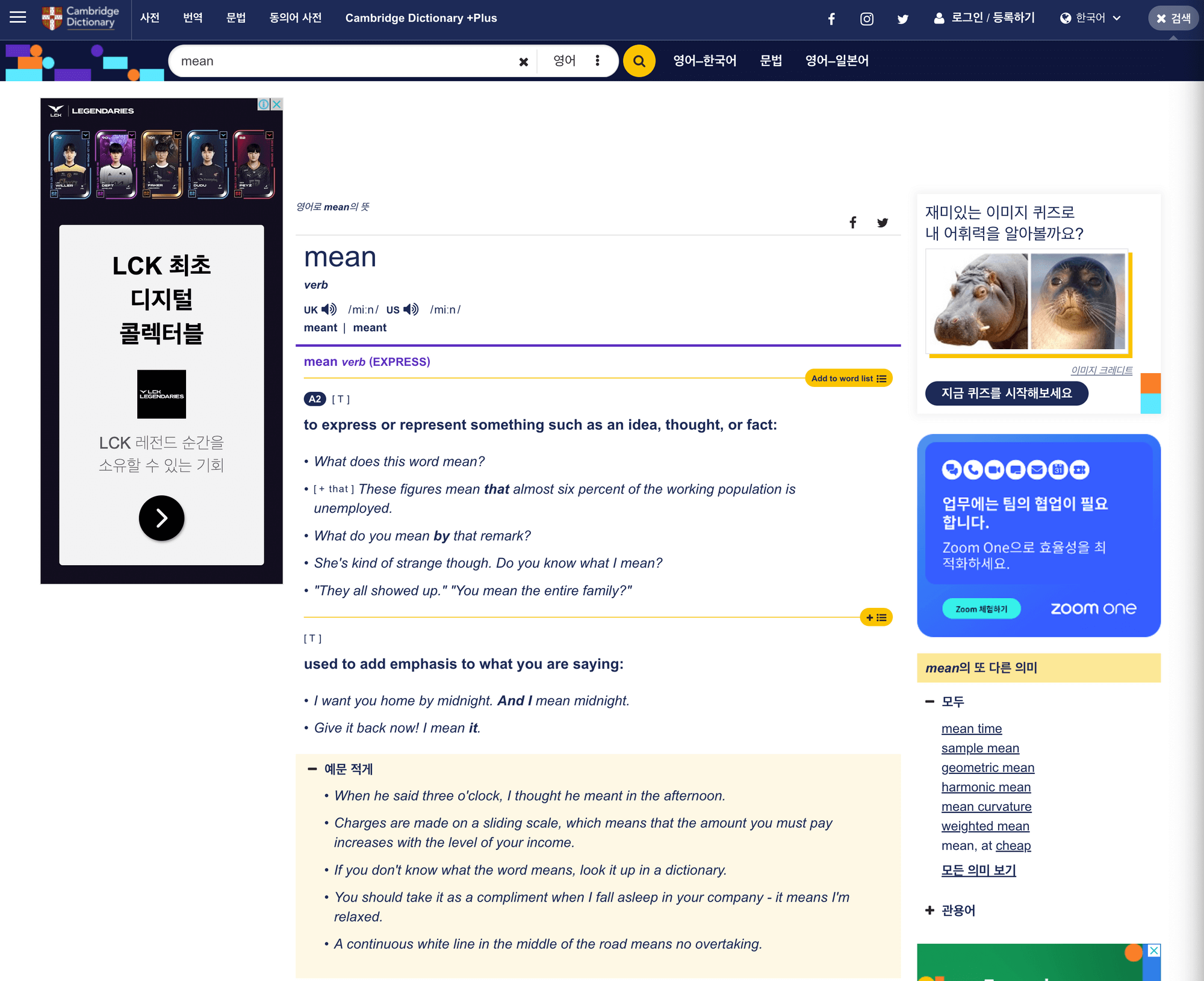 다만 캐임브리지 영영 사전과 마찬가지로 무료로 서비스되기 때문에 광고가 여기 저기 노출되는 점은 조금 아쉽습니다.