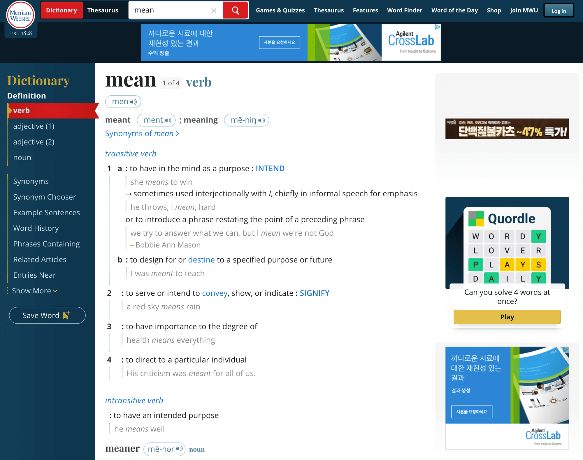 다만 사용자가 어느 정도 영어 실력을 갖추고 있고, 어떤 특정 단어의 기본적인 의미가 아닌 다른 의미를 알고 싶을 때는 조금 불편할 수 있습니다. 예를 들어 영어 단어 mean이 복수로 쓰일 때 가지는 의미 중 하나인 '수단'이라는 뜻은 사전 화면에서 쉽게 찾기가 어렵습니다.