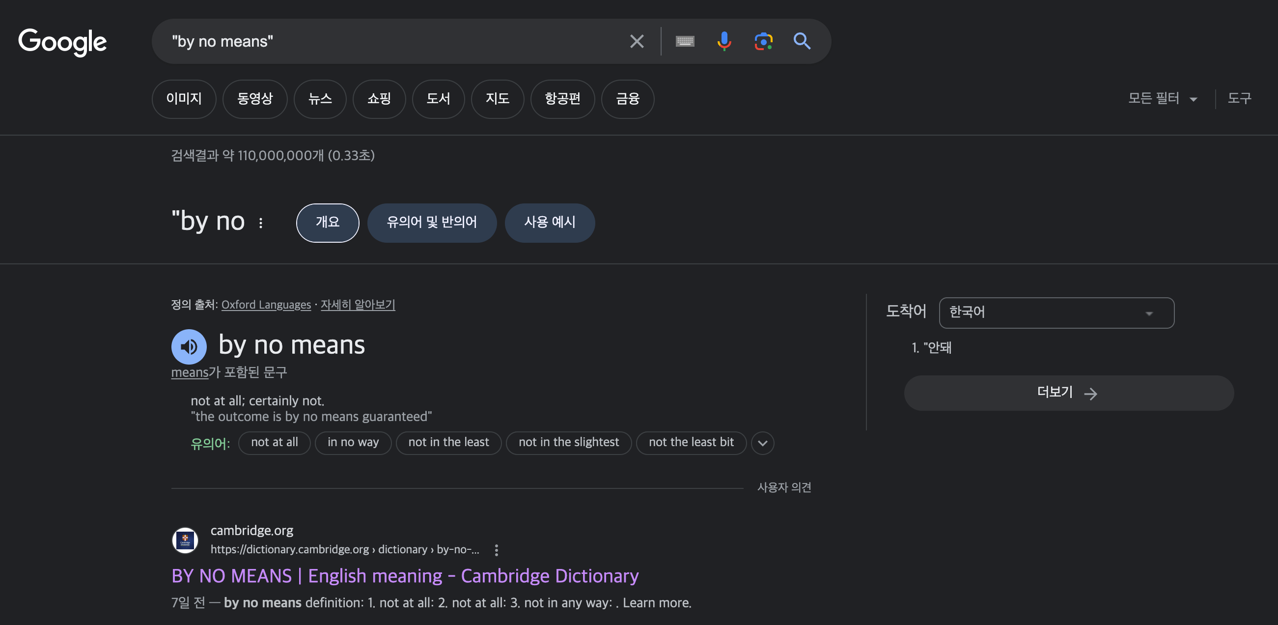 익숙한 단어로 쓰여진 문장인데, 문장이 잘 해석되지 않는다면, 온라인 사전보다는 구글 검색을 추천합니다. 이 때는 주변 단어나 구 전체를 쌍따옴표로 묶어서 검색하는 것이 효과적입니다. 예를 들어 "by no means"에서의 means는 '의미'라는 뜻과는 거리가 멀기 때문에 구 전체를 검색해야 의미를 이해할 수 있습니다. 검색 결과 중에서는 될 수 있으면 위에서 소개한 온라인 영어 사전에서 제공하는 정보를 참고하는 것이 좋습니다.