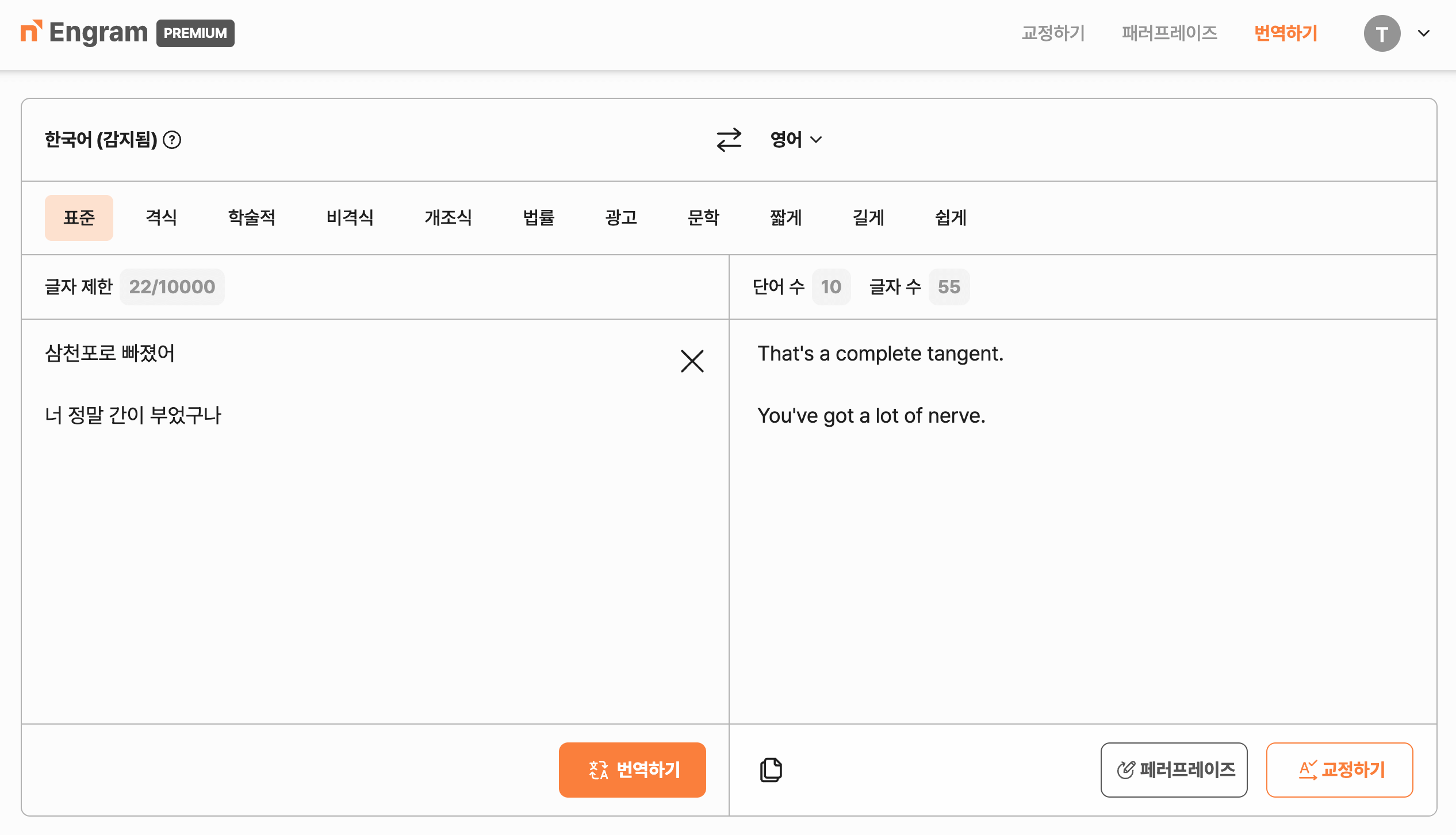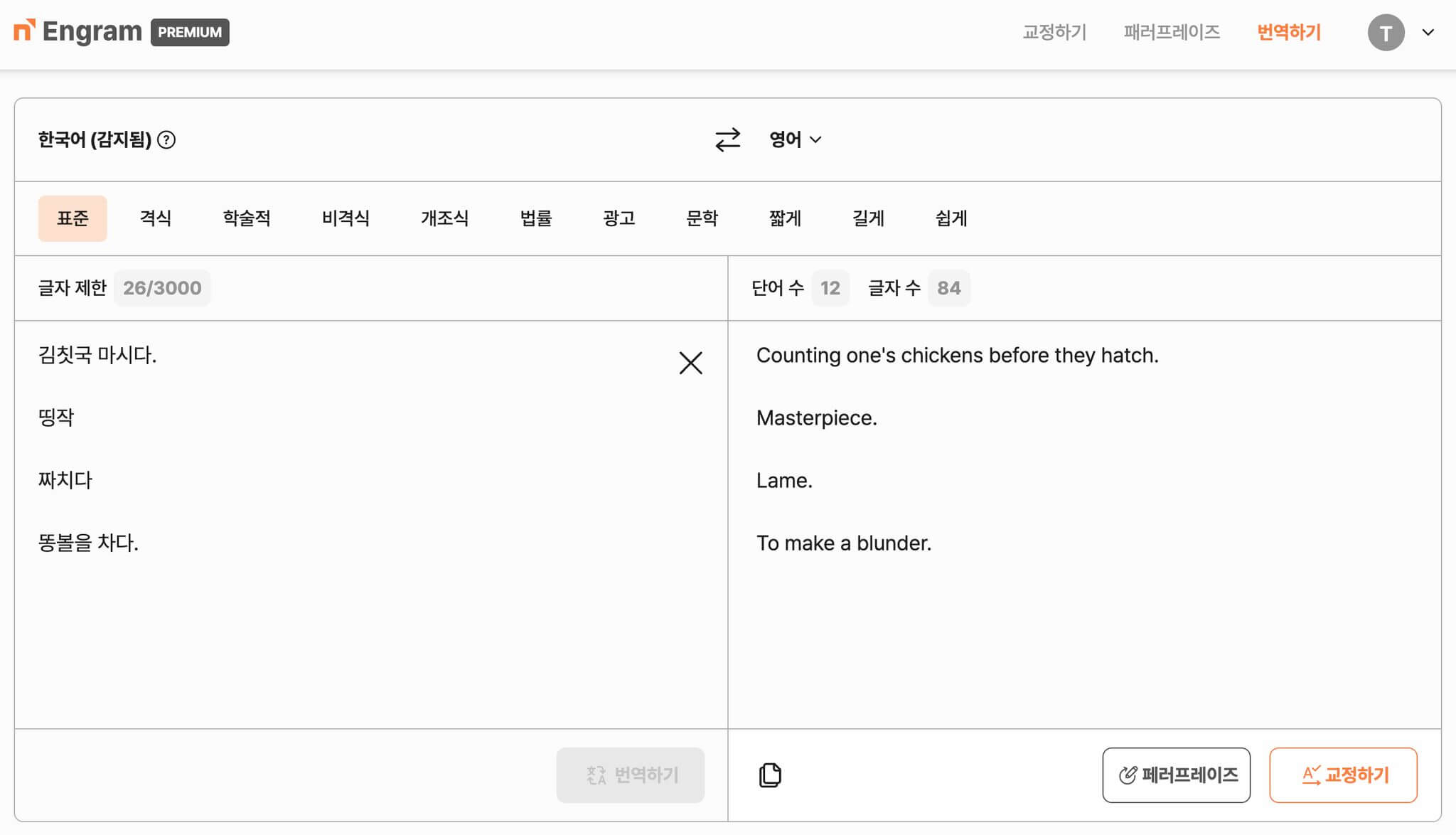 - 엔그램(Engram) 번역기 – 엔그램 번역기는 비교적 최근에 등장했지만 가장 정확하고 자연스러운 번역을 제공합니다. 영어, 한국어, 일본어, 중국어, 스페인어 등 5개 주요 언어를 지원하며, 특히 한영/영한 번역 품질이 뛰어나 번역가를 비롯한 많은 이용자들이 호평하고 있습니다. 엔그램의 가장 큰 특징은 11가지 문체 선택 기능인데, 표준적인 번역부터 격식, 학술, 비격식(캐주얼), 개조식(글머리 기호가 있는 목록체), 법률, 광고, 문학 등 다양한 문체를 지원합니다.