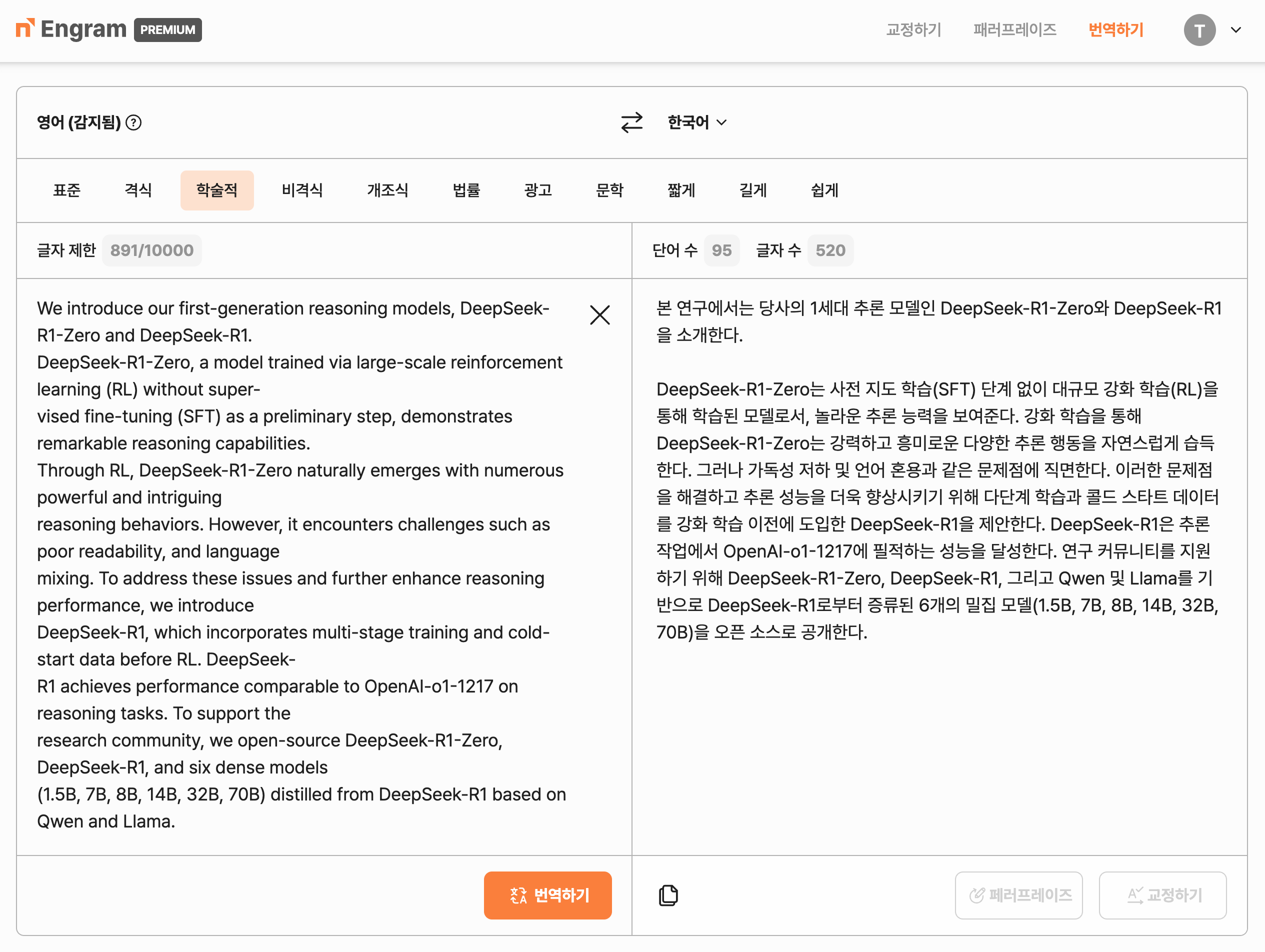 - 학술 논문 및 자료 번역: 연구 논문, 보고서, 매뉴얼 같은 학술/전문 자료의 번역에도 엔그램 번역기를 추천합니다. 엔그램의 학술적 문체는 논문 특유의 어휘와 형식을 잘 살린 번역을 제공합니다. 또한 엔그램은 pdf의 텍스트를 복사 붙이기하는 과정에서 줄바꿈이 깨진 상태에서도 자연스러운 번역 결과를 제공합니다.