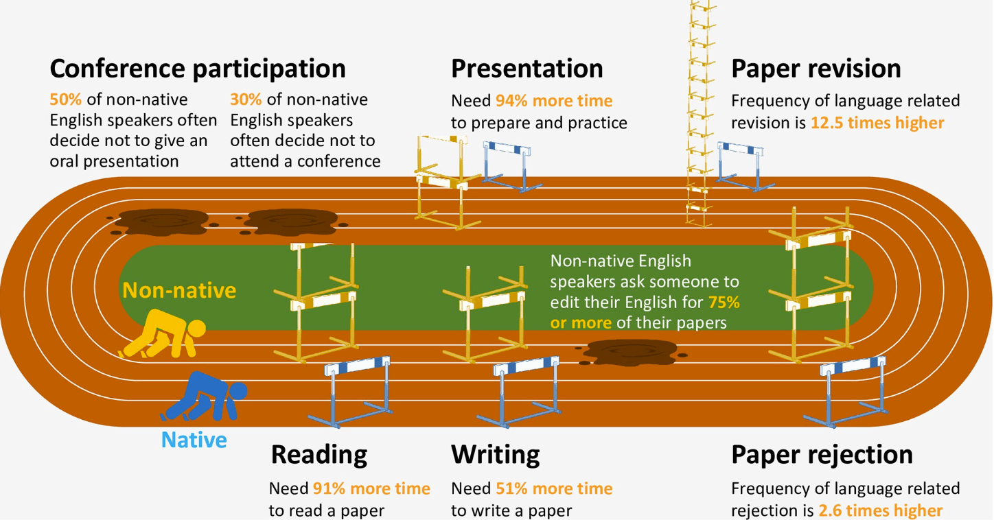 그러나 영어를 모국어처럼 구사하는 것은 어렵습니다. 따라서 영어로 어떤 일을 처리할 때는 모국어로 동일한 일을 처리하는 경우보다 더 많은 시간이 필요합니다. 한 연구에 의하면, 영어로 논문을 읽거나 쓸 때는 모국어로 논문을 읽거나 쓸 때보다 각각 91%, 51% 더 많은 시간이 소요된다고 합니다.