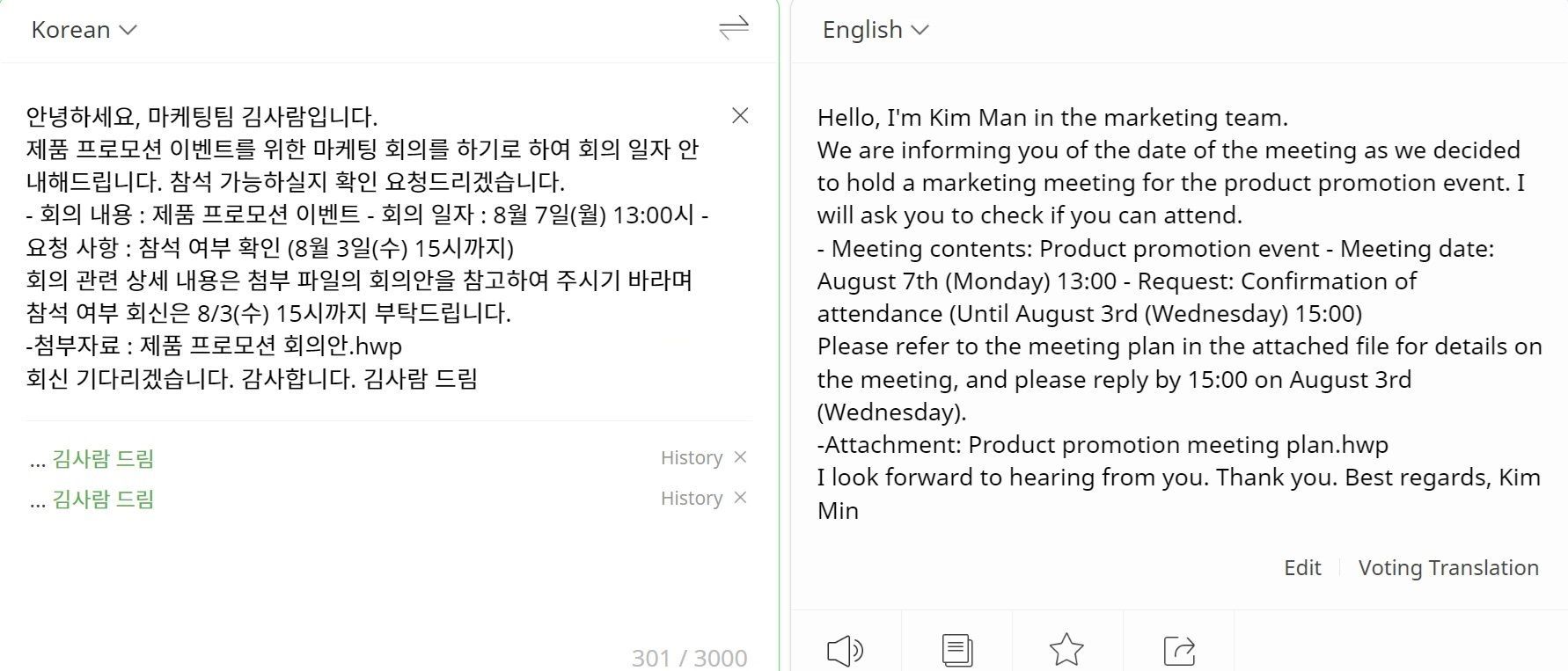 - 사람이름을 감지하지 않고 번역해서 김사람씨가 "Kim Man"이 되어버렸습니다.