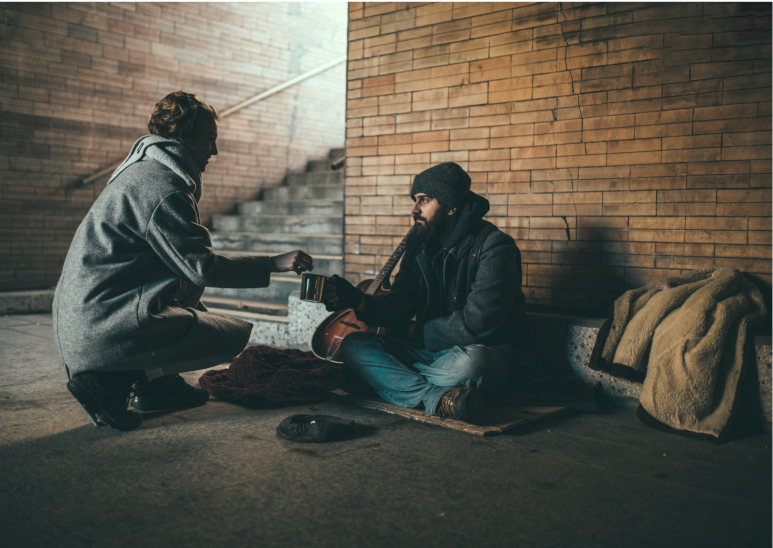 The homeless man relied on the generosity of others to survive, as he lived in a state of indigence.