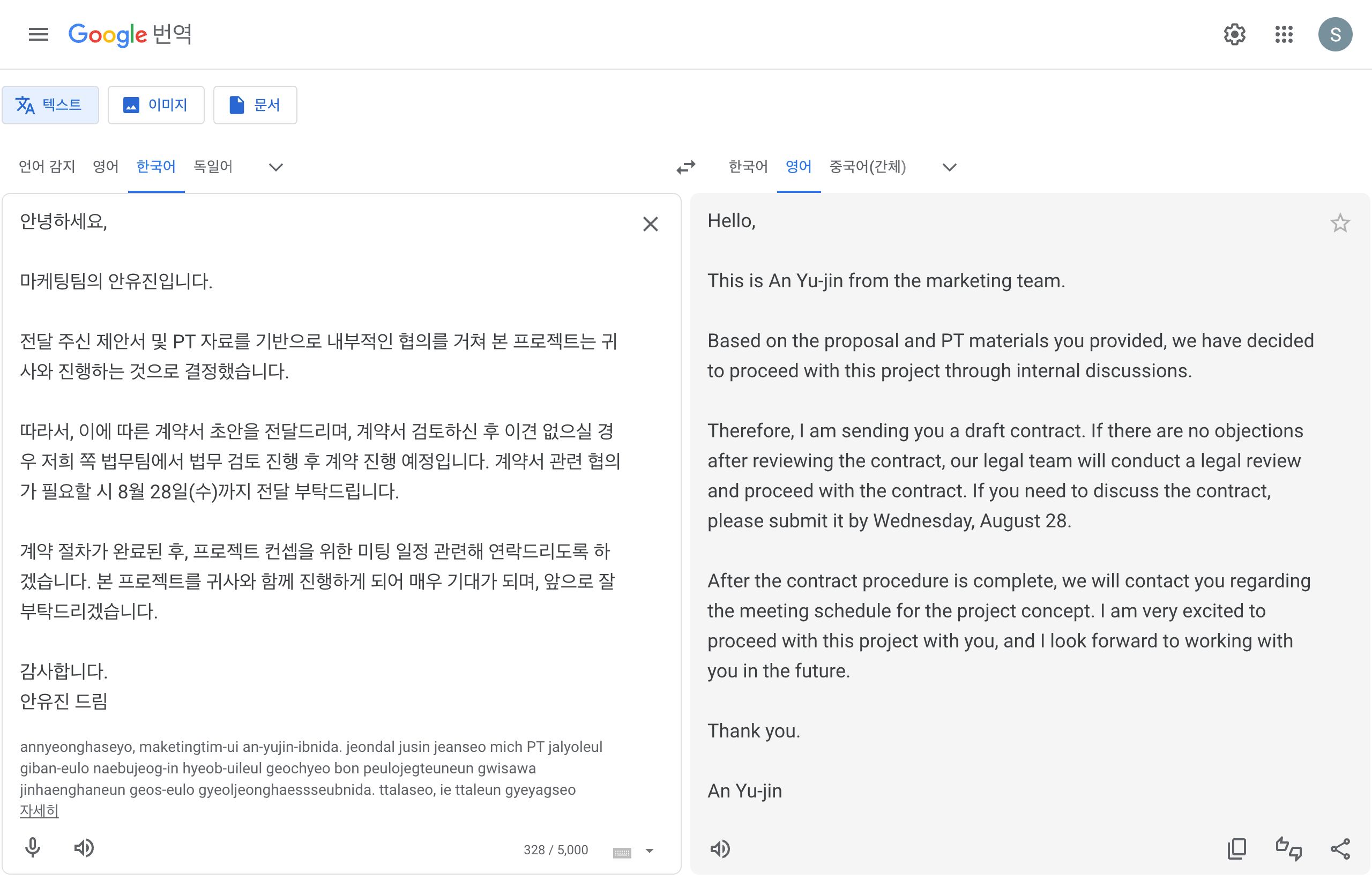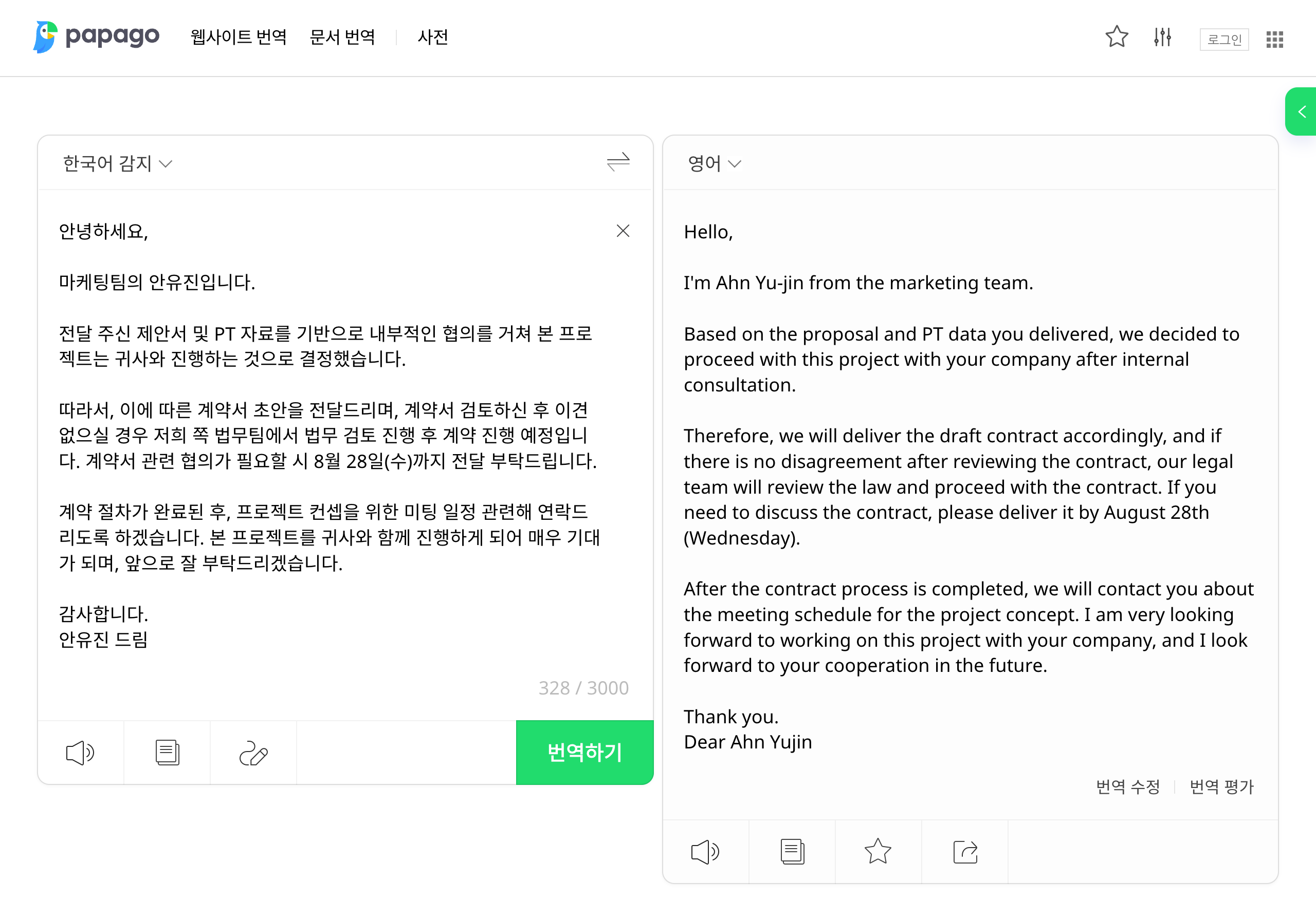 저는 영어 관련 작업 시 영어 번역기 사용을 적극 추천합니다. 영어 번역기는 한글을 영어로 번역하거나 반대로 영어로 쓰여진 글을 한글로 번역하는 데 매우 유용한 도구입니다. 영어 번역기는 잘 이해가 안 가는 영어 표현을 이해하는 데도 유용하지만, 영어로 쓰여진 글을 더 빠르게 이해하거나, 한글을 영어로 번역하는 과정을 더 효율적으로 진행할 때도 활용됩니다. 영어 번역기 사용을 추천하는 이유는 이렇게 개인의 생산성을 향상시키기 때문입니다.