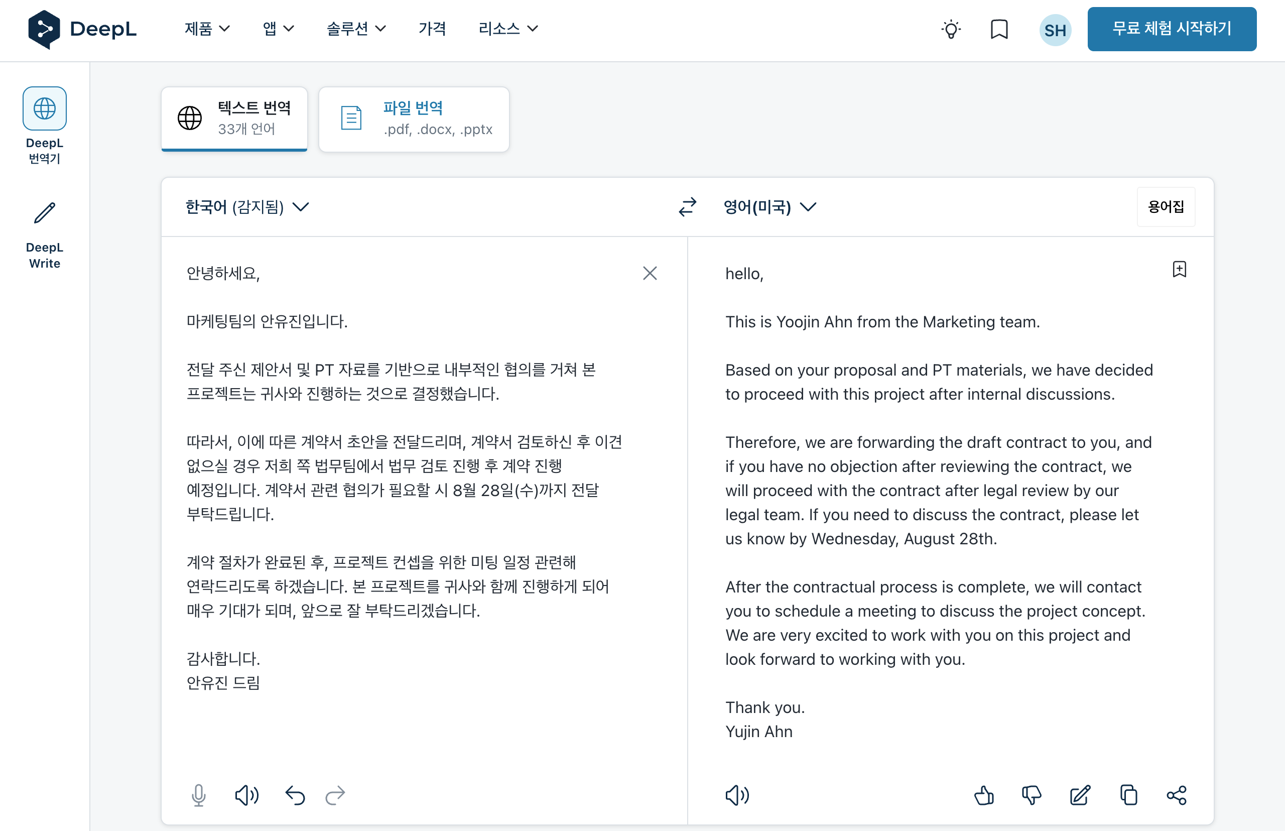 가장 정확한 번역기라고 하는 딥엘의 번역입니다.