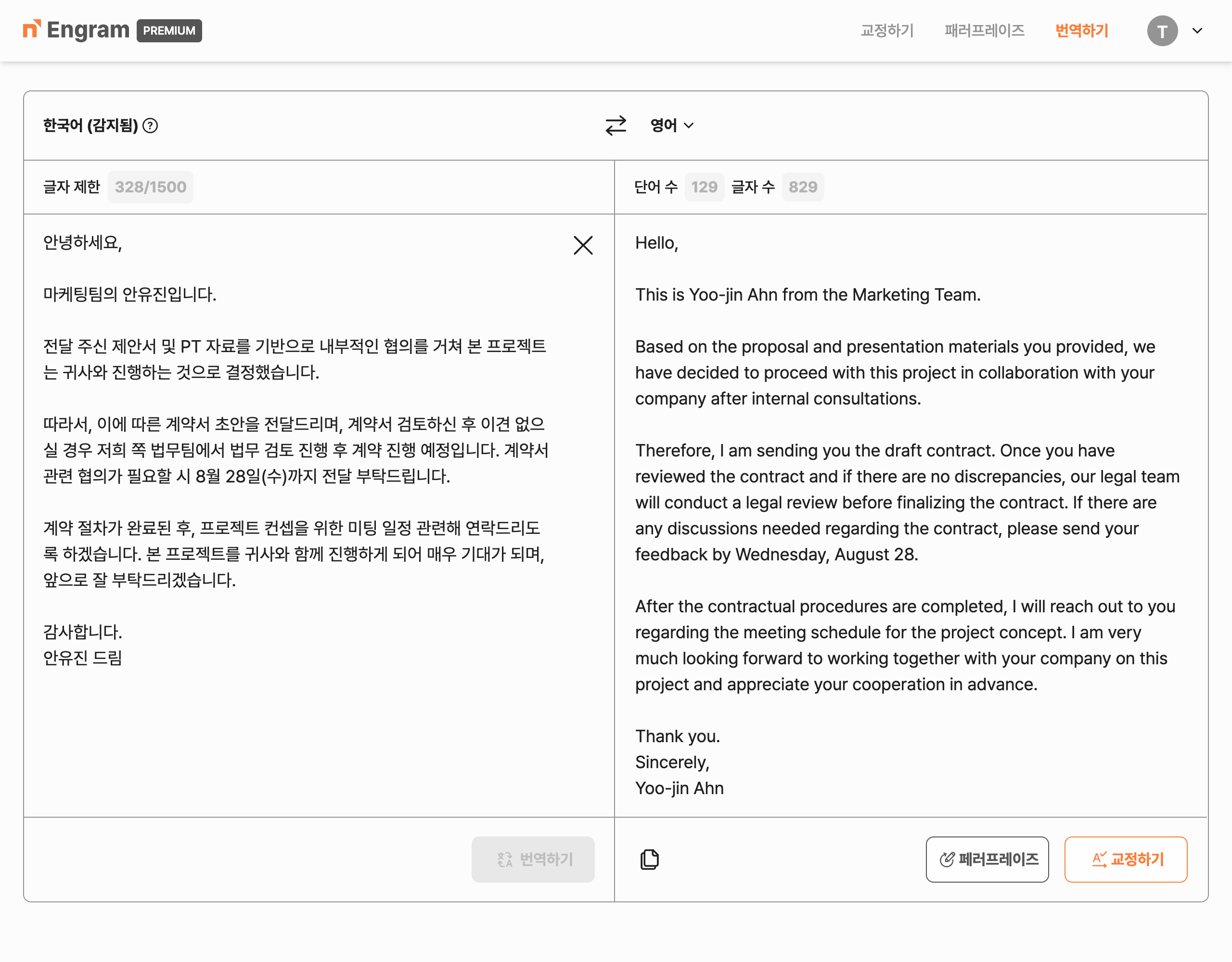 - 엔그램: 엔그램은 비교적 최근에 등장한 번역기지만, 영문 번역에서 탁월한 성능을 발휘합니다. 특히 격식, 학술적 등 11가지 문체 선택이 가능하여, 목적에 적합한 번역 결과를 얻을 수 있습니다. 번역 뿐만 아니라 문법 교정과 패러프레이징 기능을 갖추고 있어 학술 논문이나 비즈니스 문서 작성에 유용하고, 다양한 영어 표현을 익히는데도 도움이 될 수 있습니다. 이러한 이유로 엔그램 영어 번역기를 추천합니다.