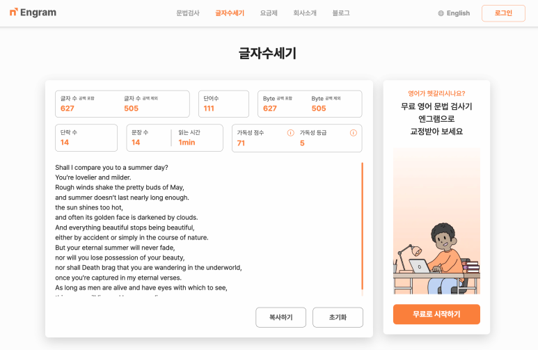 영어 맞춤법 검사기 엔그램은 공백 유무를 구별하여 글자 수, Btye 계산 뿐만 아니라, 단락 수, 문장 수, 읽는 시간 등 글쓰기에 도움이 되는 기능을 제공합니다. 하단의 링크에서 쉽고 간편하게 사용해보실 수 있습니다.